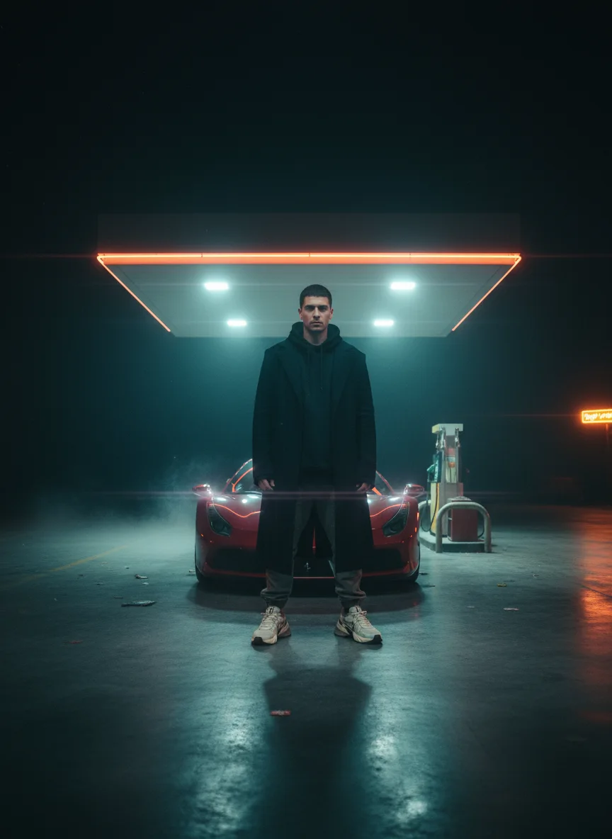 See how Scene4 transforms a simple a simple sneakers photo into a cinematic sneaker campaign fusing street energy with luxury car culture — raw, nocturnal, and visually electric.